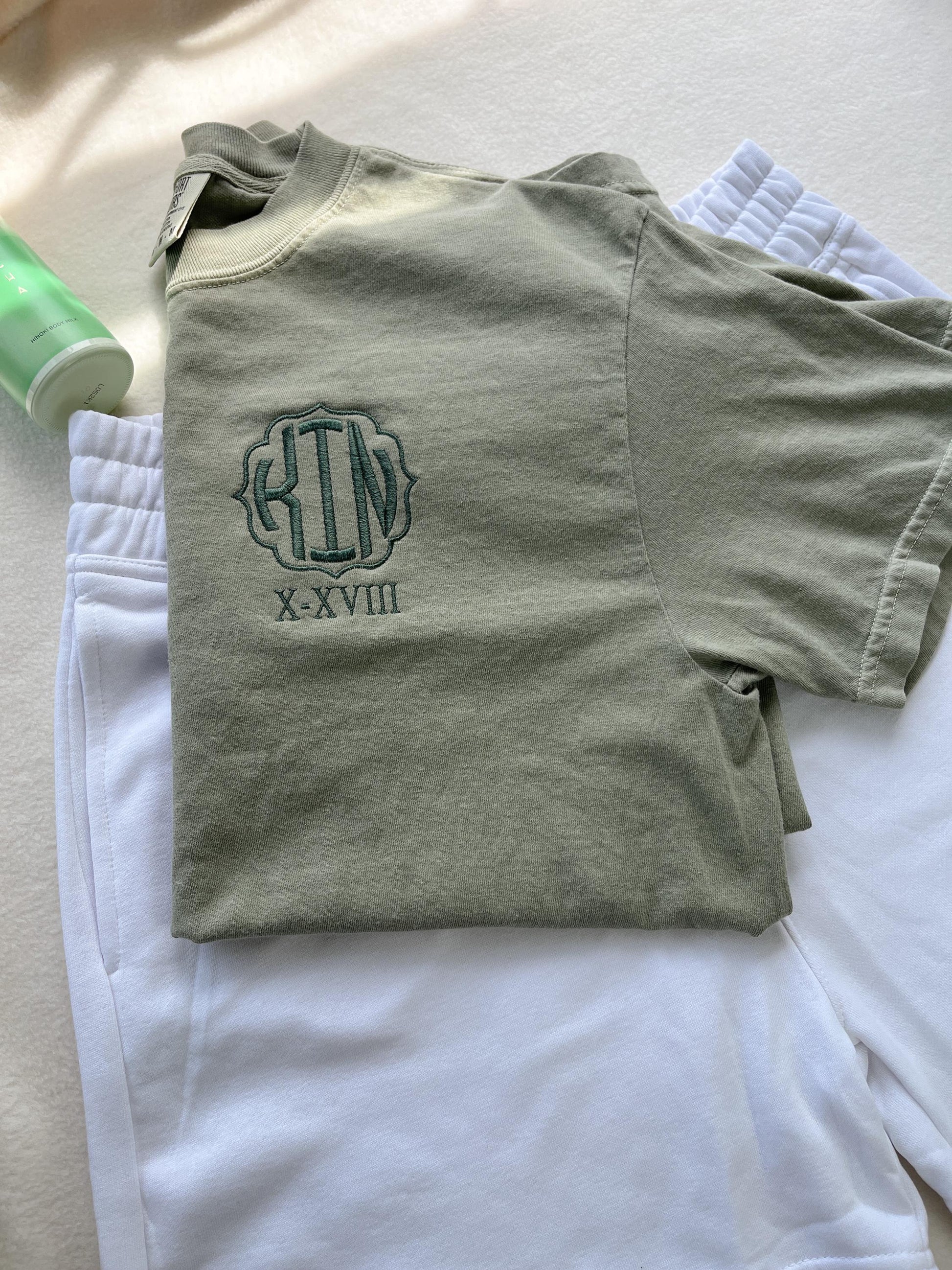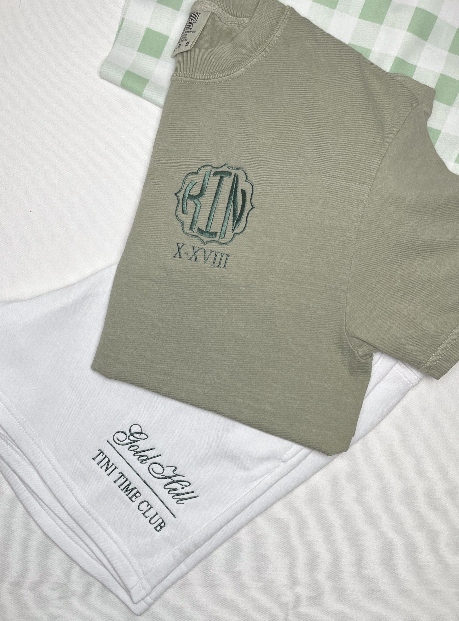 The set includes a Comfort Colors T-shirt in Bay and a pair of TriDri Fleece Shorts, both stitched with matching Willow Green thread.