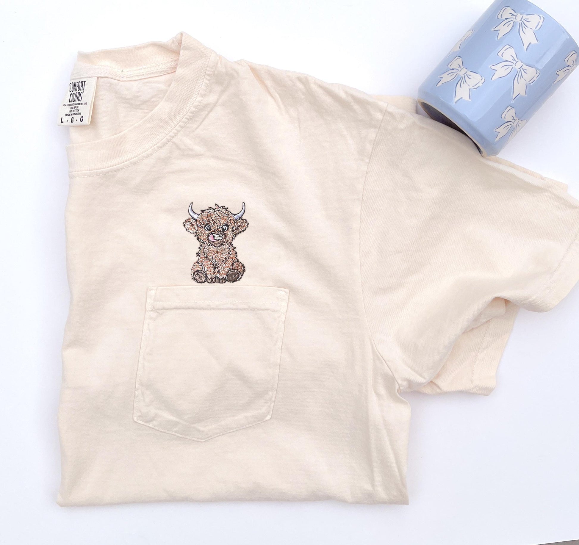 Embroidered Baby Highland Cow Original Embroidery Design Comfort Colors Pocket Highland Cow Tee Embroidered Fluffy Highland Cow T-shirt