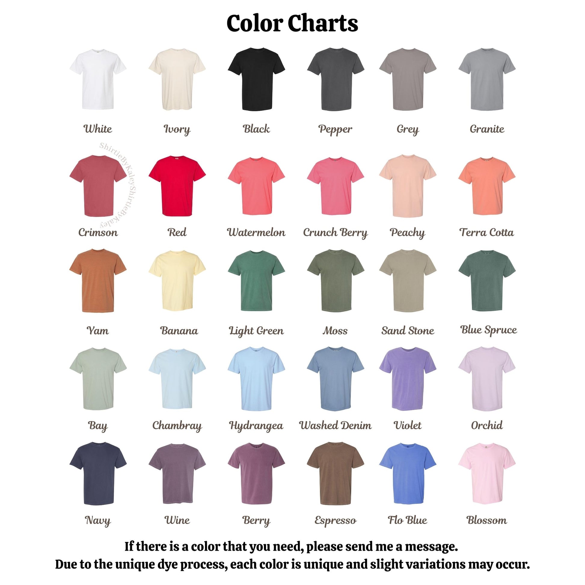 The Comfort Colors shirts are garment-dyed that made of 6.1 oz 100% soft ring-spun cotton, relaxed fit, seamless body, top stitched and ribbed collar. To achieve an oversized look we recommend sizing up 2-3 sizes.