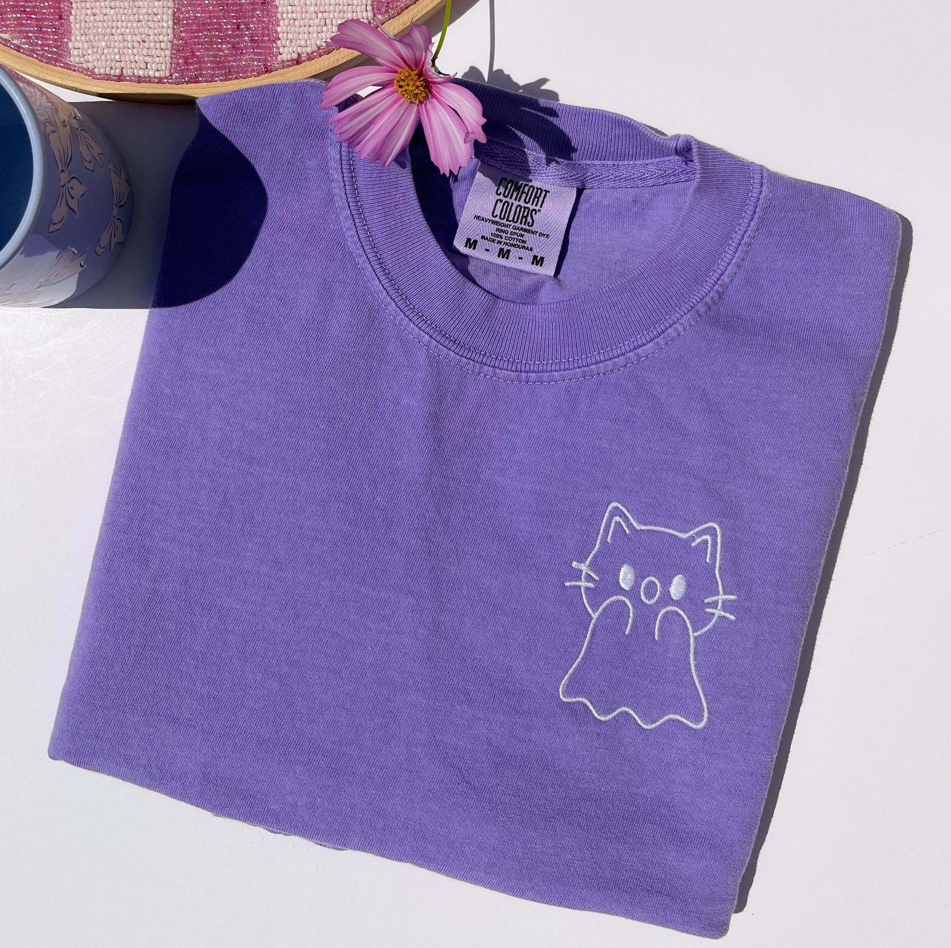 Embroidered Glow-in-the-Dark Ghost Cat Halloween Shirt - Comfort Colors Tee